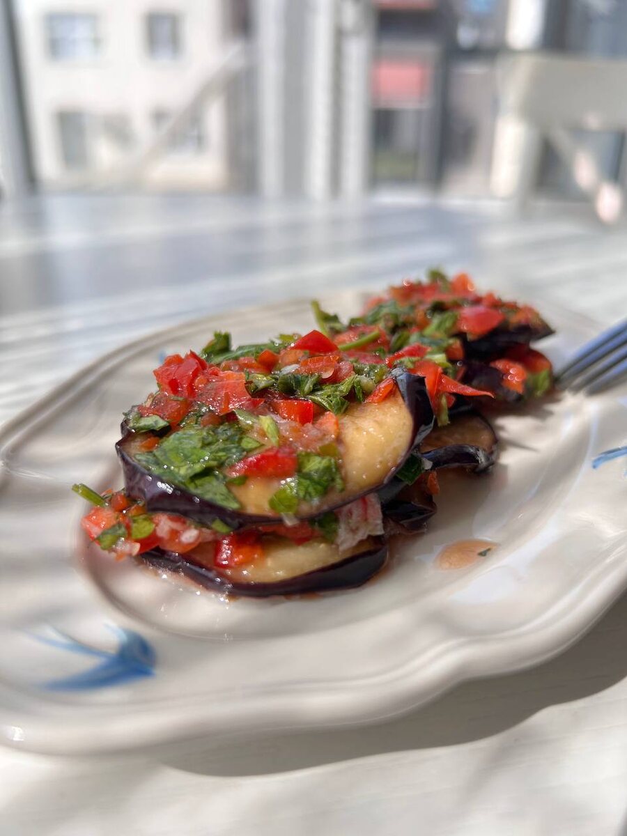 5. Каждый обжаренный баклажан обмакивать в маринад и укладывать в контейнер. На дно можно посыпать смесью зелени с перцем.