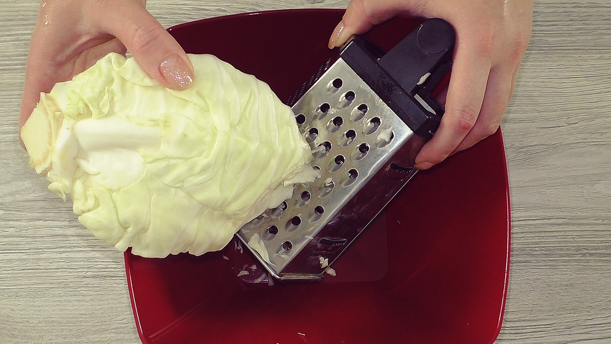 Первым делом капусту стоит натереть на крупной терке. Если тереть в миску неудобно, можно использовать разделочную доску, а затем переложить в ёмкость. Крупные кусочки капусты следует мелко нарезать. Если капуста жесткая, её можно залить кипятком на 5 минут. Для молодой капусты достаточно слегка посолить и помять руками.